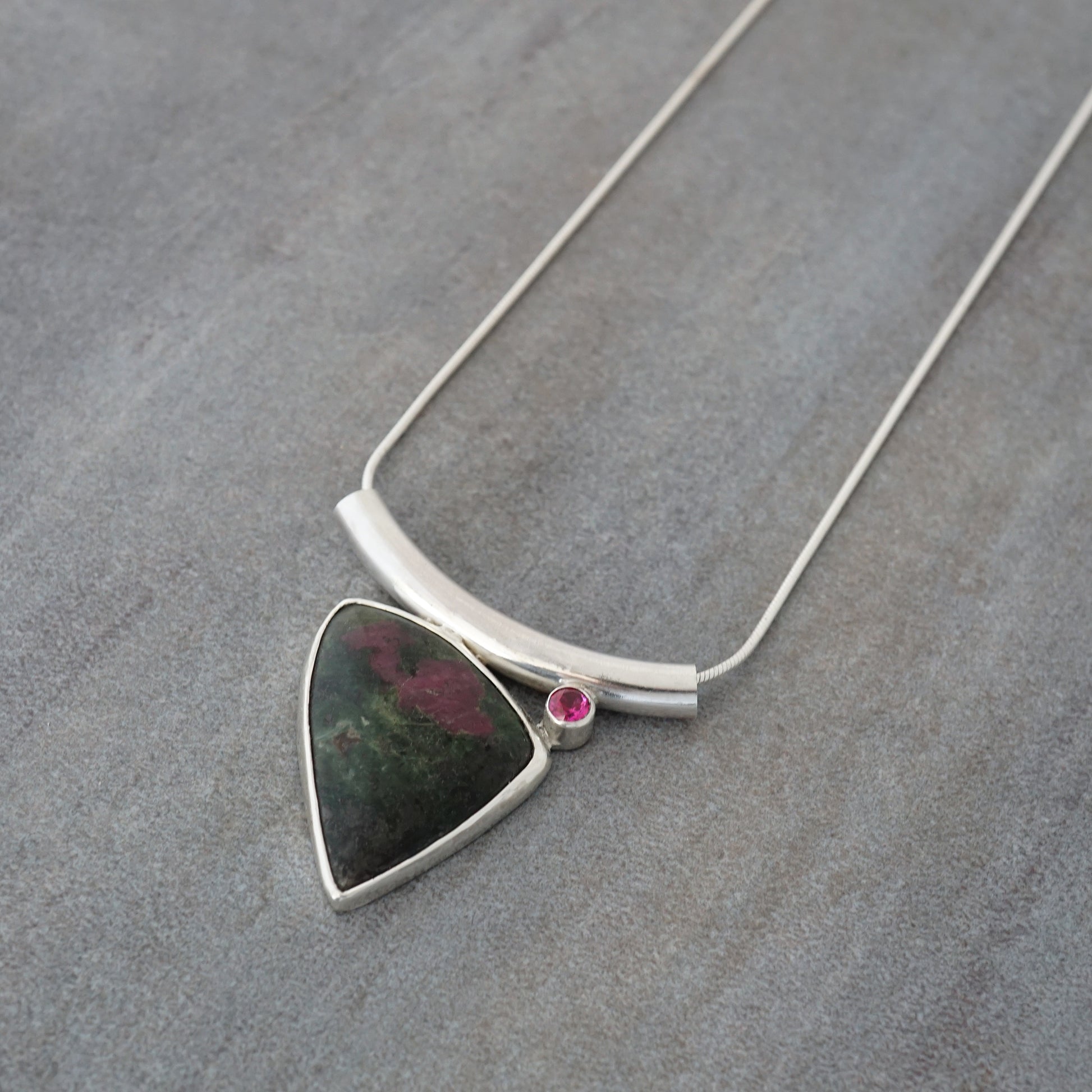 A beautiful One of a Kind piece; a [Canadian hand-cut] Ruby in Zoisite cabochon and a faceted Ruby make up this OOAK Statement piece. Comes on a 18" Sterling Silver Snake Chain.