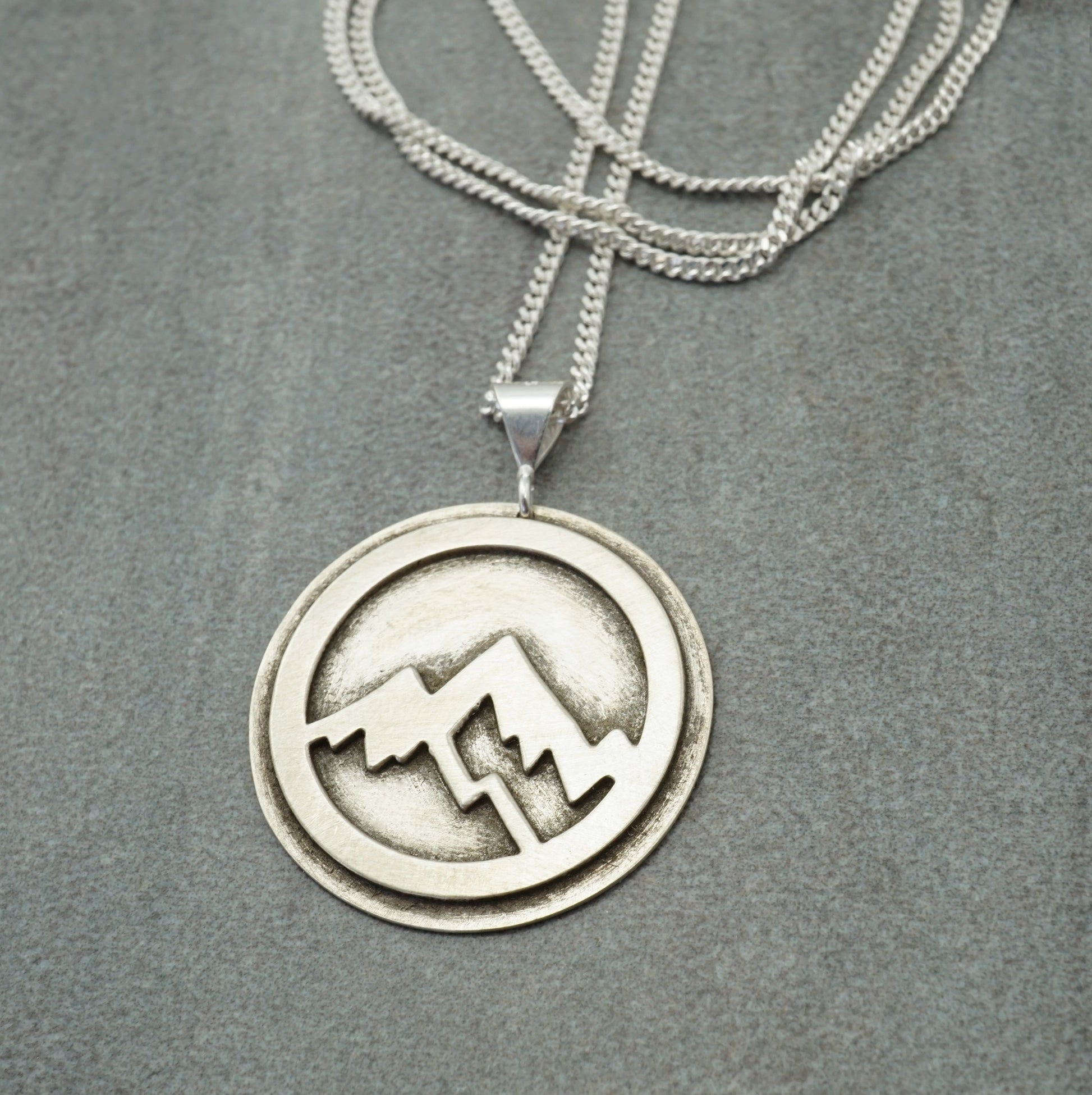 This solid sterling silver mountain pendant was cut out by hand using a jeweller's saw before being soldered to back plate and then darkened with a liver of sulpher patina and buffed, which makes this simple hand-drawn mountain silhouette pop.