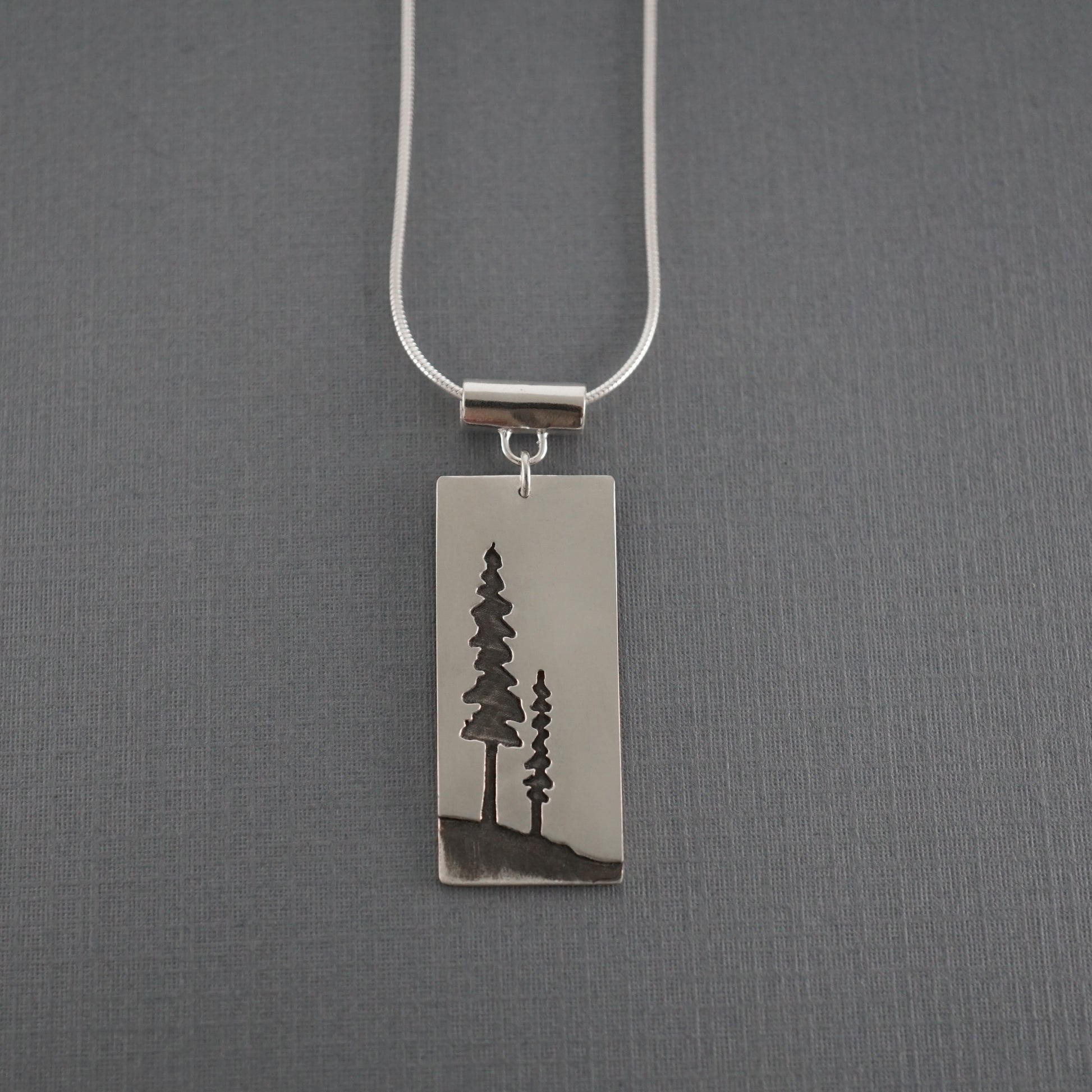 Double pine tree pendant, hand-cut out of sterling silver sheet with a patina added to make the trees stand out.