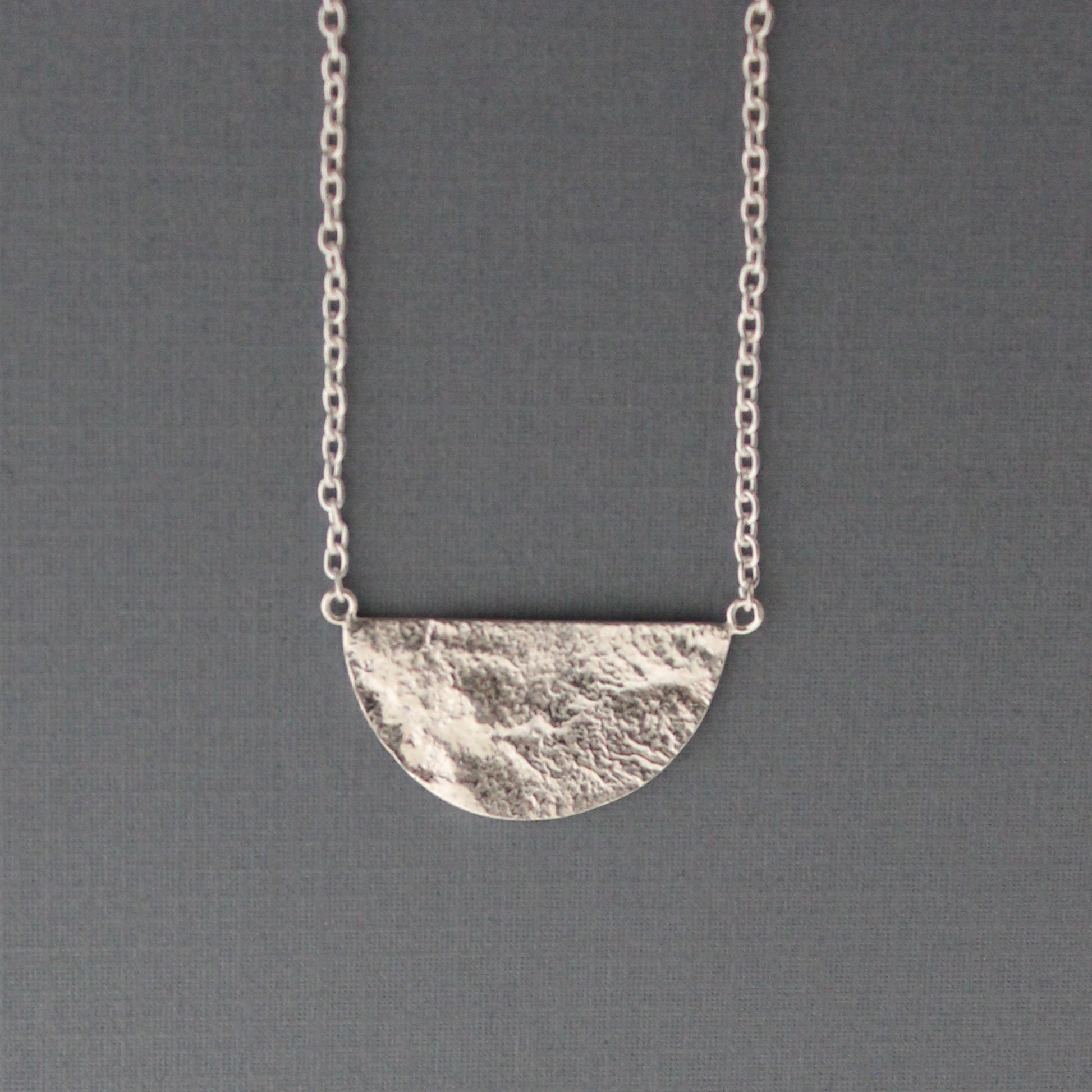 This gorgeous solid sterling silver necklace can be worn night or day. The texture is created by repeatedly heating the sterling silver up and letting it cool until the copper boils out, causing the beautiful, OOAK undulations in the surface.