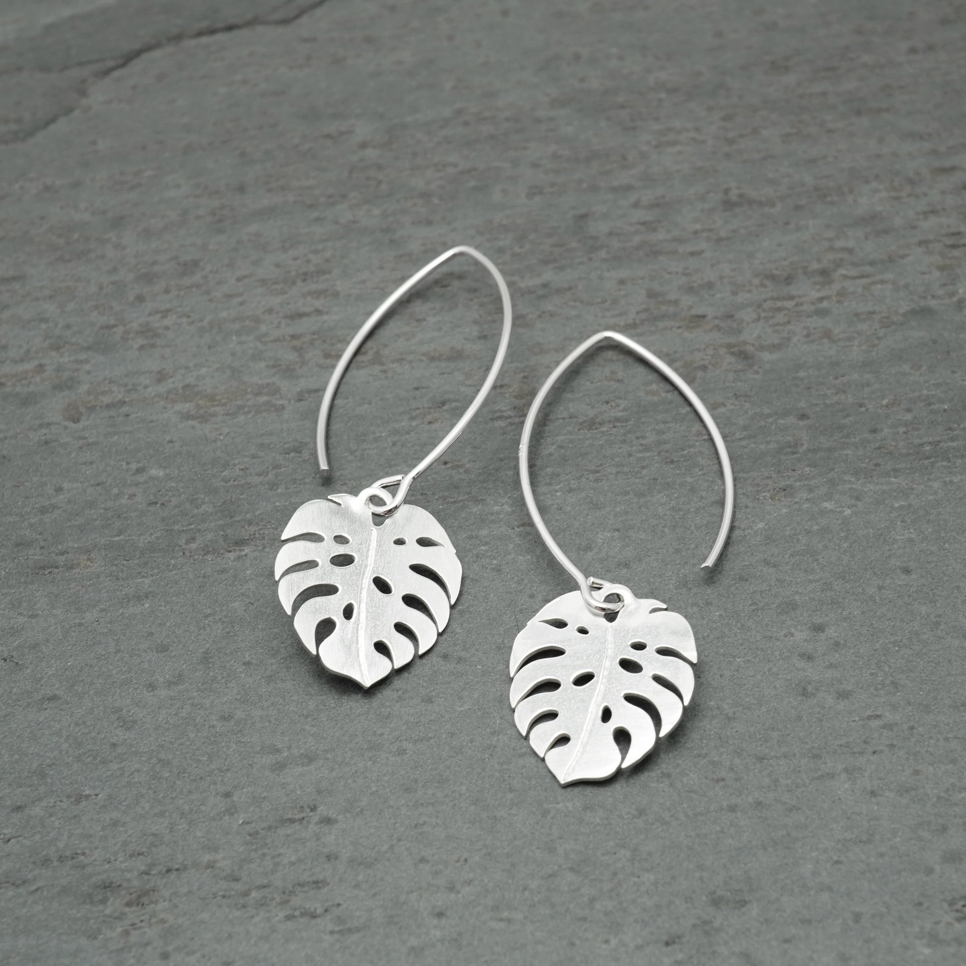 Beautiful dangling monstera leaf earrings hand-cut of out solid sterling silver sheet.