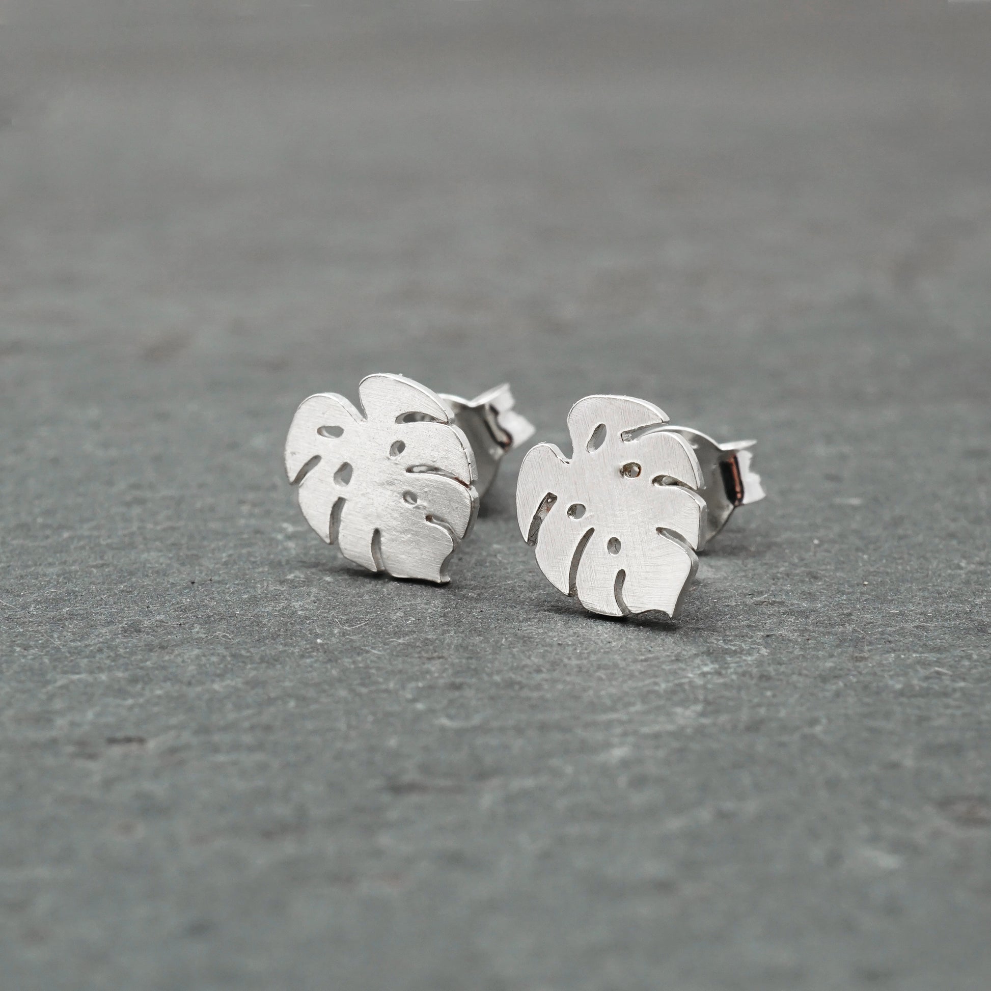 Cute little Monstera Deliciosa leaf stud earrings. Hand cut out of solid sterling silver sheet and fabricated using traditional jewellery techniques