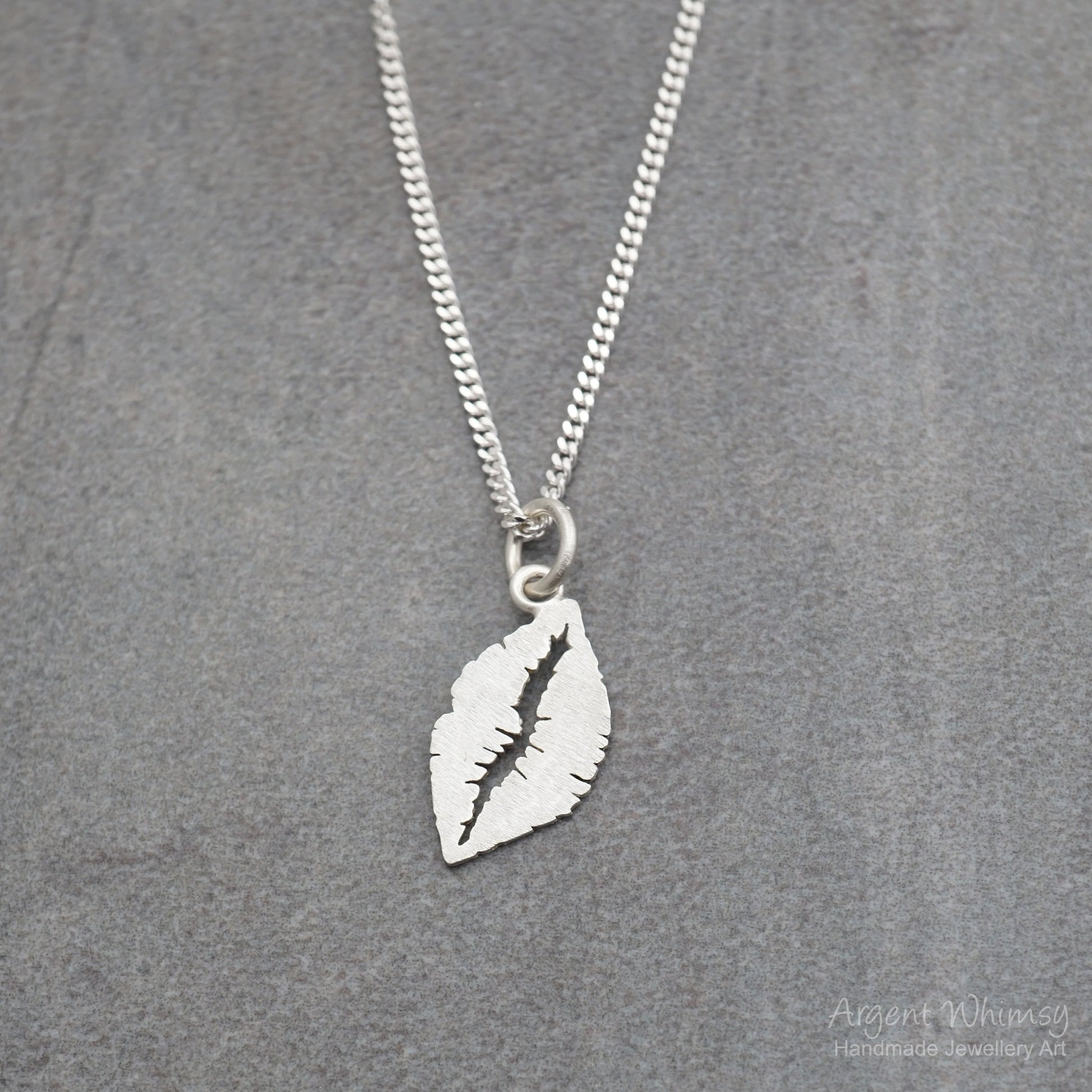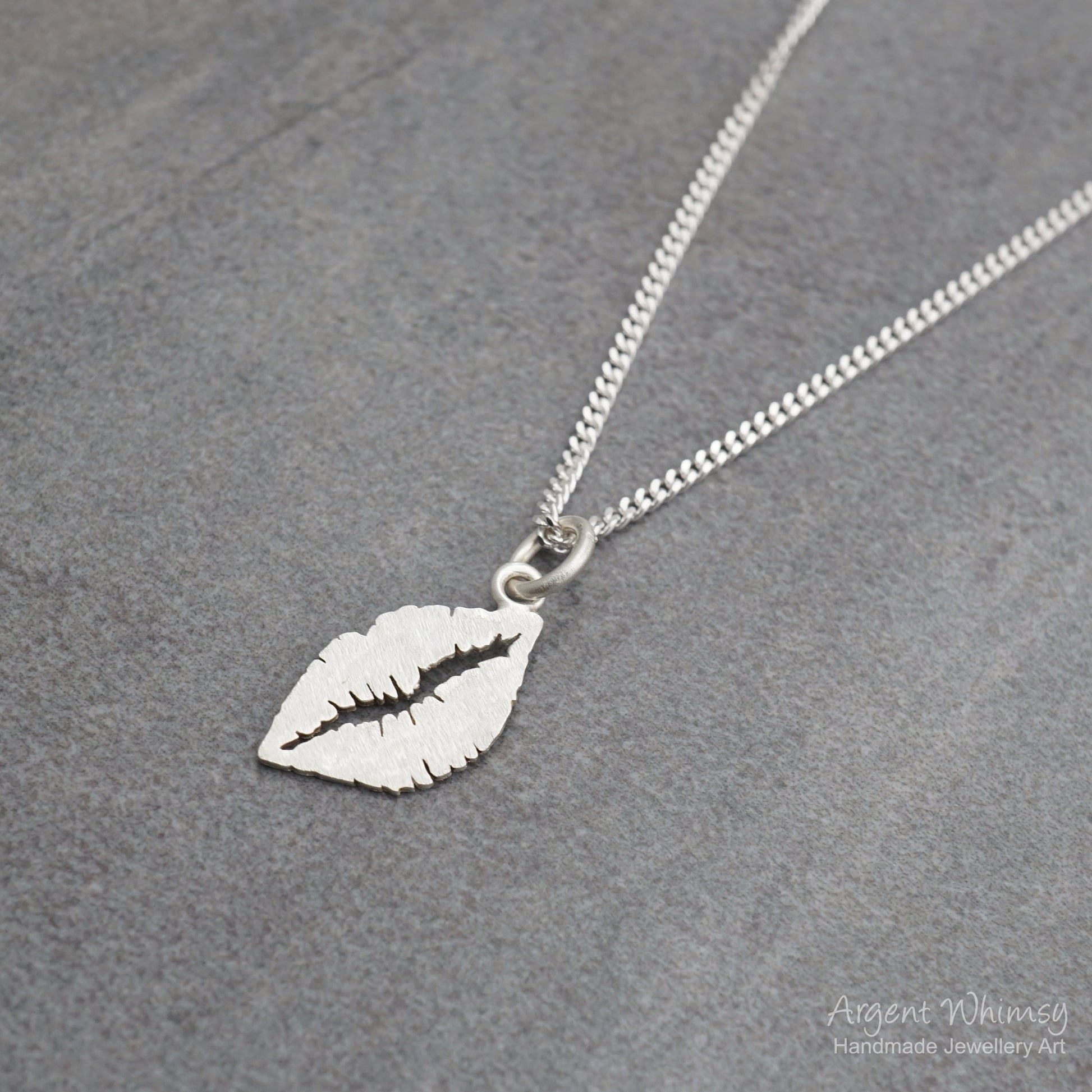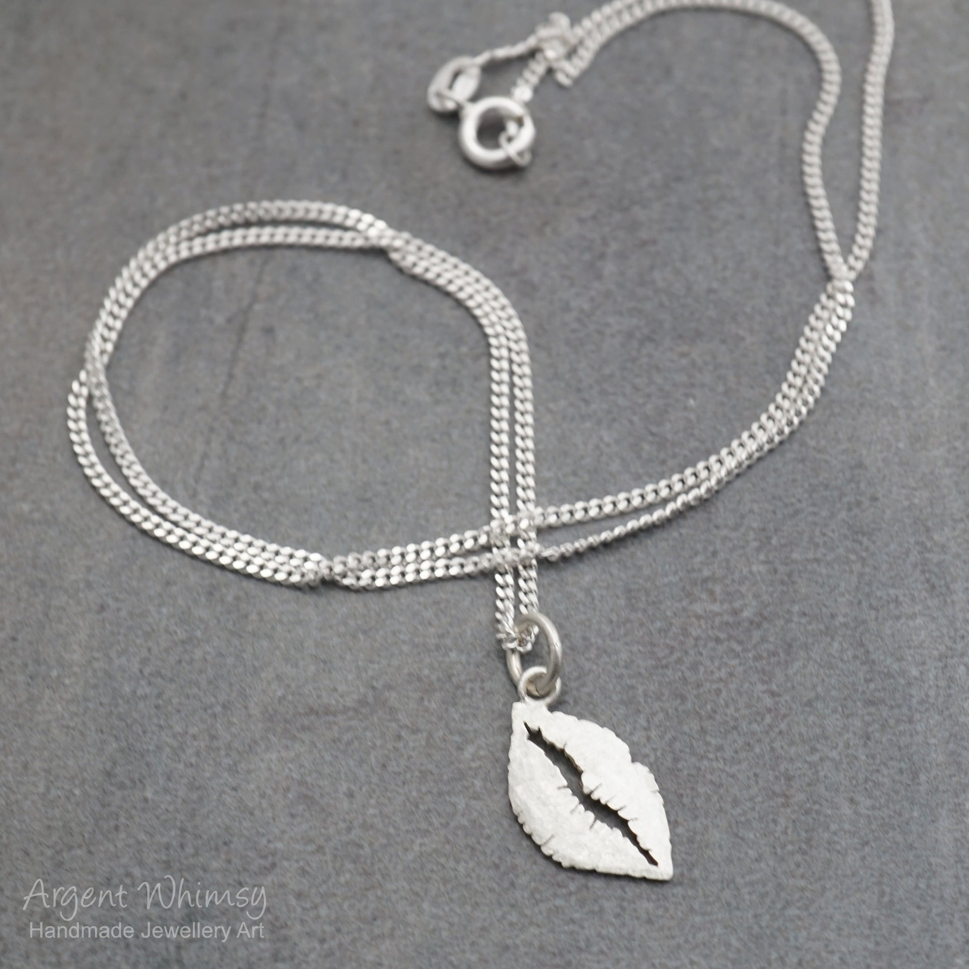 Medium sterling silver "Charm Style" lips necklace with a sparkle-frost finish.