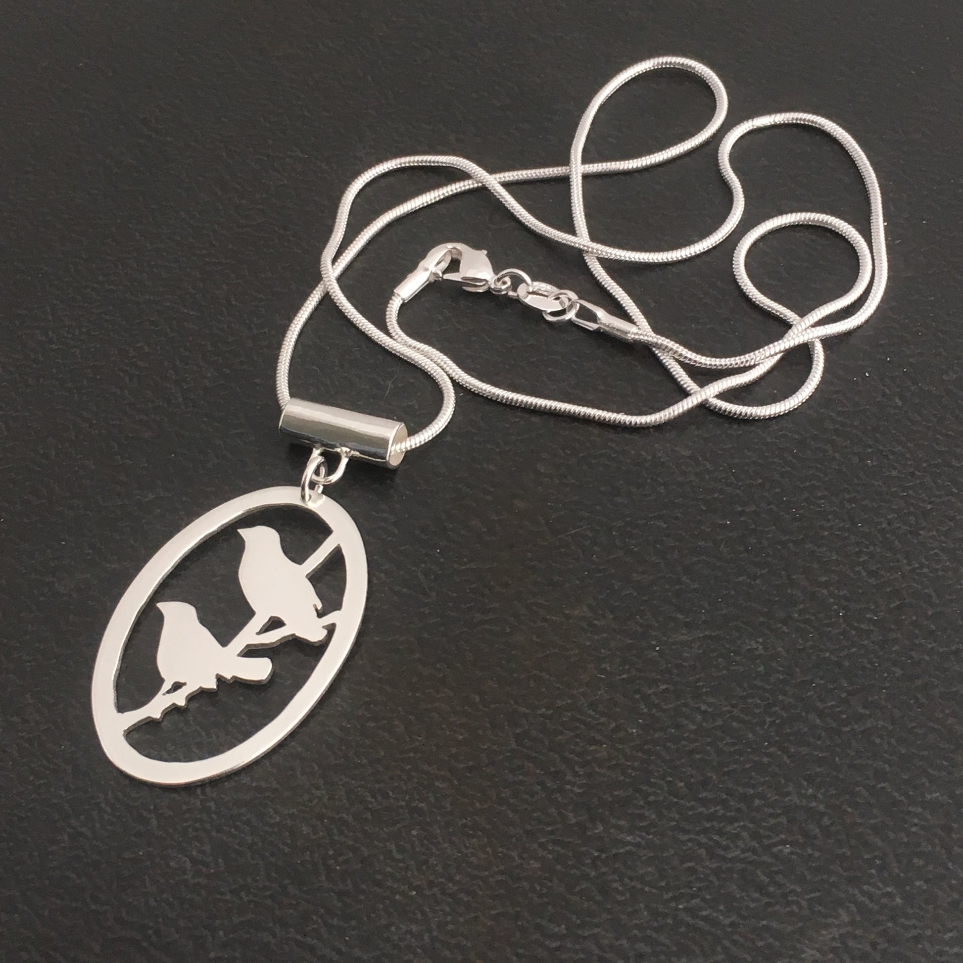 Family, friends, or just two birds, this beautiful solid sterling silver necklace was entirely cut out by hand using a jeweler's saw.